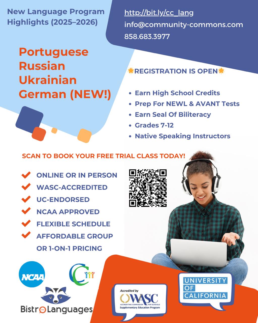 We partner with BISTROLanguages, a nationally accredited independent language school to promote strategic languages learning opportunities to youth. We provide 1-on-1 and group classes. Our program includes four years of Ukrainian, Russian, Portuguese, German and Georgian languages for grades 7-12. Our courses are accredited by Western Association of Schools and Colleges (WASC), fully approved for A-G purpose by the High School Articulation division of the UCOP Office of Undergraduate Admissions, and also are NCAA-approved (NCAA HS code 853458.) High school students may transfer earned credits to their school transcripts. Our curricula cover language, history, culture and literature. Our programs prepare students to function in real-world situations, academic, and career-related settings. By engaging students in various interdisciplinary projects we inspire them to use the language to develop critical thinking, collaborate with their peers around the world and to solve real-life problems. We also offer preparation courses for the German, Russian, and Portuguese AP and NEWL exams and AVANT STAMP 4S language assessment, serving as an official testing center for both NEWL and AVANT. These exams provide AP-style score reports that students can use for college credit and/or placement.